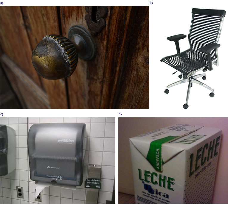 Fuente: a) https://commons.wikimedia.org/wiki/File:Knob_of_a_door_in_Santa_Mar%C3%ADa_de_Gu%C3%ADa.jpg, b) https://en.wikipedia.org/wiki/File:Bungee_chair.JPG, c) https://flic.kr/p/wxi1Y, d) https://es.wikipedia.org/wiki/Archivo:Abre_f%C3%A1cil.jpg