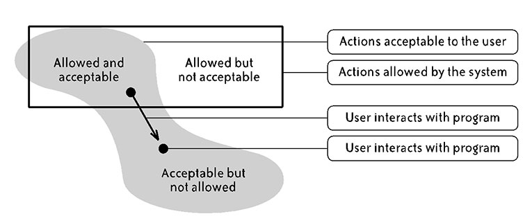 El principal desafío de diseño de una interacción segura es minimizar la probabilidad de eventos no deseados mientras se realizan las tareas previstas por el usuario de la forma correcta y lo más fácil posible. Para ello, K. P. Yee define dos requerimientos fundamentales: el control de autorizaciones (por ejemplo, procesos de autentificación) y una comunicación eficaz.